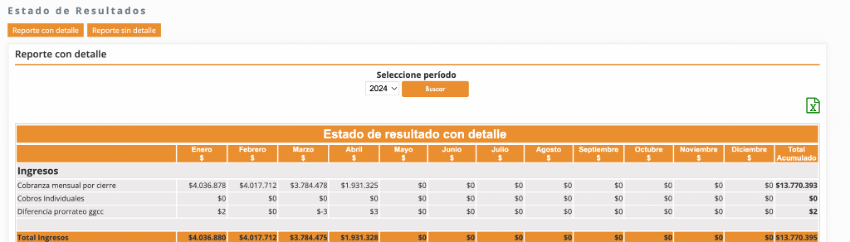 - Los ingresos que se muestran corresponden a la cobranza generada en cada prorrateo.
