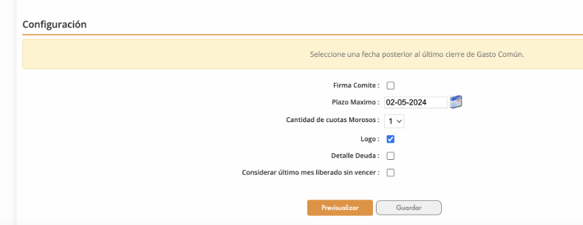 - Aviso de suspensión 2: puedes cambiar el saludo inicial de la carta, también el cierre de la misma; así como, ingresar un plazo máximo de pago, definir la cantidad de meses morosos a considerar, considerando o no el último período de Gasto Común cerrado, y mostrar o no el detalle de los meses morosos.
